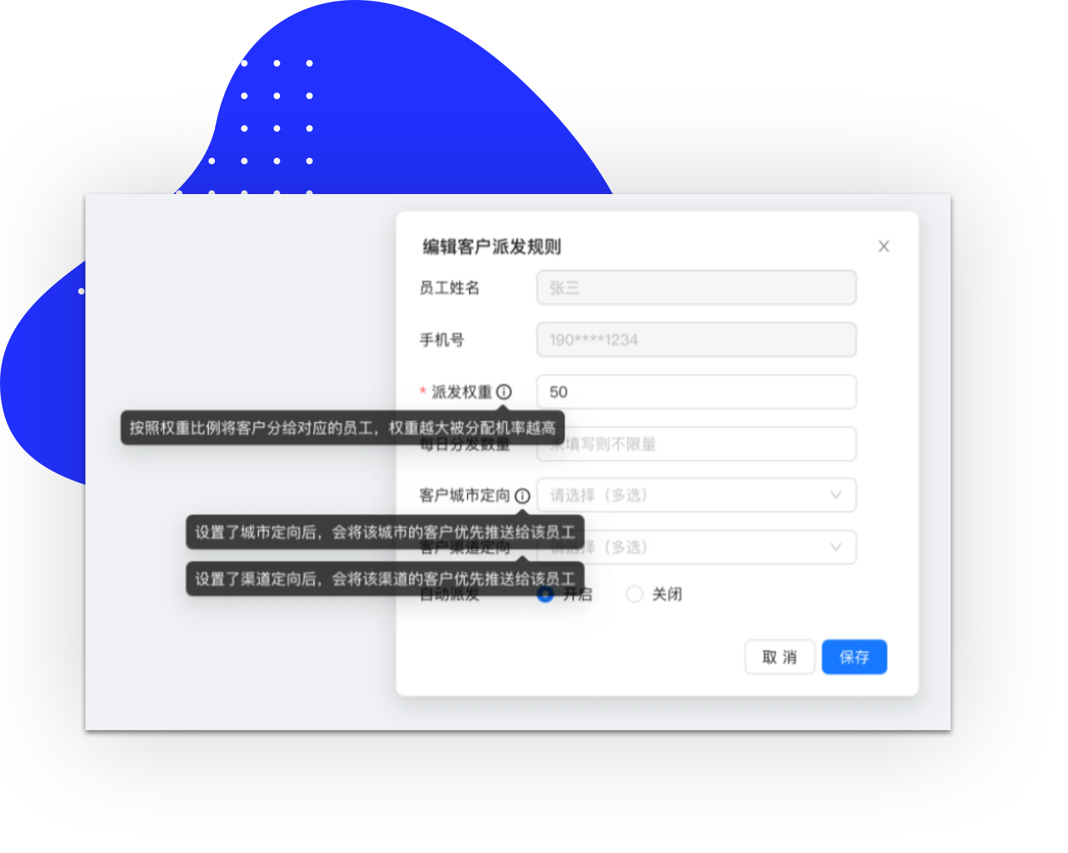 系统规范化管理,流程清晰明了,设置渠道和城市定向,可按销售人员能力,合理分配客户。